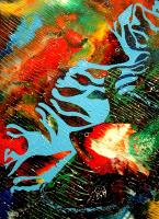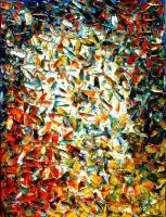 Hormis les peintures qui relèvent du carsonisme, on peut remarquer la présence d’un deuxième style pictural chez Carson : les mosaïques qui se définissent par une fragmentation multiple, voire presque en all-over de la forme et des surfaces qui rappellent en un certain sens les mosaïques d’un Riopelle dans sa meilleur période des années 1950 ou, plus loin encore, les œuvres d’un Seurat ou d’un Signac identifiées sous le nom du divisionnisme tel qu’on avait connu à la fin du XIX siècle. Or, il me semble évident de souligner qu’un certain recul s’impose lorsqu’on regarde ces mosaïques afin que notre œil puisse distinguer la forme d’un hibou ou d’un immense oiseau peint généralement de face au centre du tableau. On pourrait lire à travers la symbolique de ces oiseaux solitaires de nuit un genre d’autoportrait de l’artiste, car autant la solitude que la nuit représentent des éléments indispensable pour Carson dans l’acte de peindre.