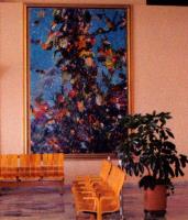 De plus, le fait que l’être humain soit rarement représenté dans ses œuvres s’explique par le recours de l’artiste aux éléments naturels dont la symbolique fonctionne par analogie subtile à l’homme. Dans la structure chargée des masses colorées intenses composées de rouge, jaune, bleu, blanc, noir, vert, orange, ocre, et violet, se détachent des jardins remplis des fleurs, des arbres, des oiseaux, des différents animaux qui réunis chantent l’hymne d’une nature enchanteresse. Mais, le motif le plus récurent de ses œuvres reste le poisson. Symbole Mythique et religieux, le poisson connote tout un univers dont le sens continue au-delà de ces toiles.