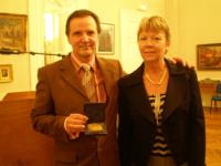 Charles Carson, reçoit la médaillé d'honneur, par la secrétaire générale, Madame Lydia Fayel, pour souligner à l’endroit de l’artiste, l’excellence, la qualité et la créativité de son oeuvre hors du commun.
