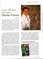 Une semaine plus tard, elle rencontrait Charles Carson. Au début, ils ont parlé simplement, un peu pour s’apprivoiser, pour se connaître mutuellement. Puis, elle a découvert un homme qui en avait long à raconter. « Lorsque l’on écrit une biographie, on entre dans la vie intime des gens. C’est très intense. Charles est un artiste, alors c’est quelqu’un d’extrêmement sensible. C’est un écorché vif », raconte Anne Richer. Pourtant, ses toiles ne sont-elles pas joyeuses ? « Je crois que sa peinture est une manière de s’efforcer au bonheur. Pour lui c’est naturel sur le plan pictural et ça l’aide à garder l’équilibre. Il a fait ce choix sur le plan de sa peinture : avoir une peinture joyeuse. »