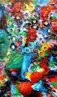 Semble-t-il que tout est déjà dans sa tête, qu’il n’a pas de croquis et qu’il ne fait pas de dessins sur sa toile au préalable. « Par exemple, j’ai vu un tableau qu’il était en train de faire, avec un fond coloré. Il y avait du rouge, du jaune et du bleu, mais informe. Il s’est mis à vouloir donner une forme, alors il y est allé avec un pinceau. Puis là, il a fait des touches. Tout à coup, on voit apparaître quelque chose. Je ne sais pas comment il fait, c’est spécial. Tout à coup, il y a eu des fleurs, un bouquet est apparu ! C’est de la magie pure », s’étonne-t-elle toujours.